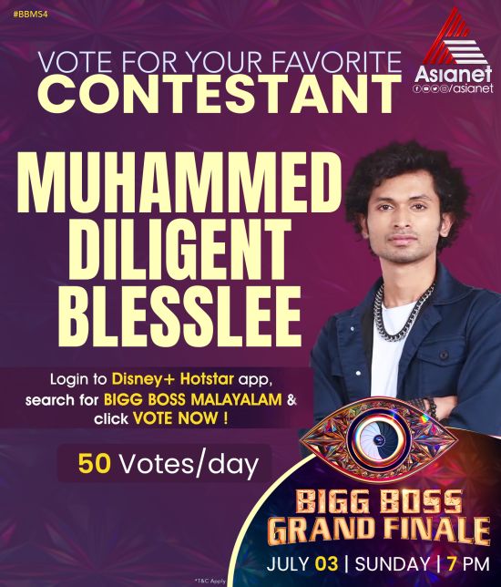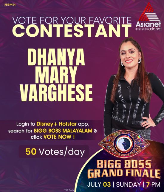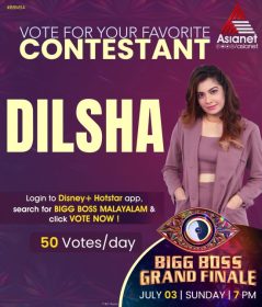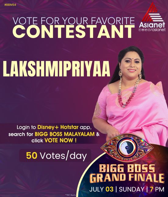 | Vote For Lakshmipriya | നിങ്ങളുടെ പ്രിയപ്പെട്ട മത്സരാർത്ഥിക്ക് വോട്ട് ചെയ്യുക ബിഗ് ബോസ് 4 – Disney+Hotstar ആപ്പിൽ ലോഗിൻ ചെയ്യുക, ബിഗ് ബോസ് മലയാളം എന്ന് തിരയുക, ഇപ്പോൾ വോട്ട് ചെയ്യുക ബട്ടണ് ക്ലിക്ക് ചെയ്യുക – 50 വോട്ടുകൾ / ദിവസം, 250 വോട്ടുകൾ / വോട്ടിംഗ് സൈക്കിളിൽ ഹോട്ട്സ്റ്റാർ ബിഗ്ഗ് ബോസ് വോട്ടിംഗ് ഓൺലൈനിൽ. | |
